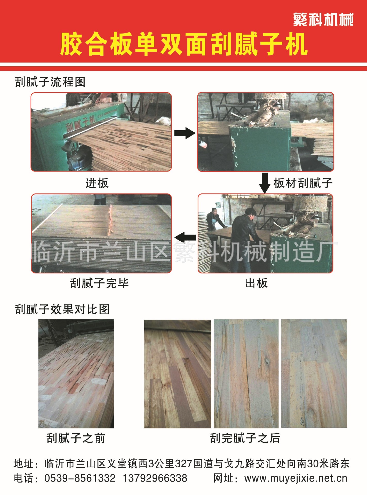 板材刮膩?zhàn)訖C(jī)是“用膩?zhàn)訌浹a(bǔ)板面表面缺陷”而發(fā)明設(shè)計(jì)的一種專用設(shè)備。主要應(yīng)用于對細(xì)木工板,多層板等板材有缺陷(坑洼,縫隙及凹陷等)的表面施加膩?zhàn)舆M(jìn)行膩平,使其板面平整。它具有操作簡單,維修方便,工作效率高,外觀精致,打出的板面平整,質(zhì)量好等特點(diǎn)。使用該設(shè)備進(jìn)行生產(chǎn),一次性完成,生產(chǎn)效率高。減輕勞動強(qiáng)度,解放大批勞動力,降低產(chǎn)品成本,提高經(jīng)濟(jì)效益。并且給機(jī)床結(jié)構(gòu)合理,操作簡便,實(shí)為人造板廠家的理想選擇。
